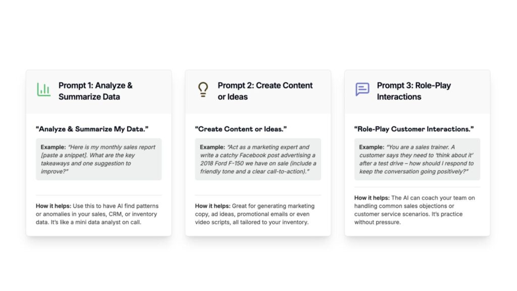 Here comes the fun part. With all your data loaded or accessible to the AI, you pose the ultimate question: â€śGiven all this information, what should our dealership do next quarter to improve sales and performance?” This is a broad, open-ended prompt, and that’s okay. The AI will sift through trends and metrics in your data to generate a strategic answer. Essentially, it will output an executive summary or action plan drawn from the evidence.