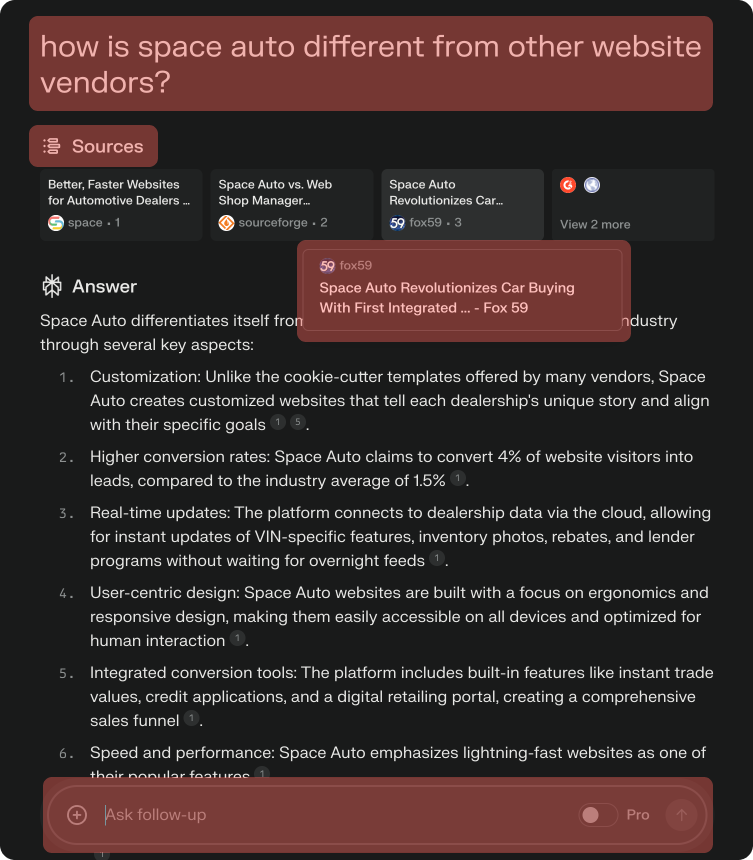 Ultimately saving the user time, our most precious resource. Seen below, you can see the original query, followed by the sources it scoured, including a Fox News article on Space Auto to simply output all of the internets combined knowledge. You then have the ability to ask follow-up questions, and further define your search to get the answers you need, all while retaining the information previously asked.